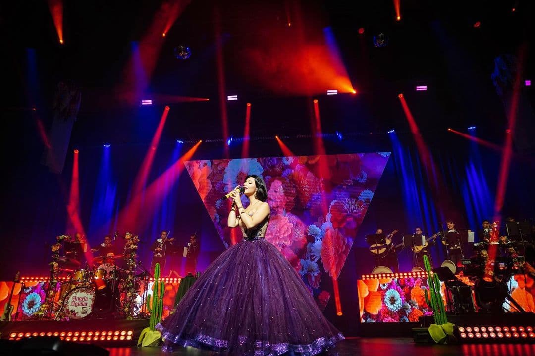 Al igual que Nina, Ángela portó un vestido color blanco en los shows que dio en Las Vegas y San Diego durante el mes de marzo 2022. Éste, aunque es de lo más parecido a los tradicionales vestidos de quinceañera, innova en la falda de peluche y en los bordados de lentejuelas con figuras de corazones y notas musicales, mismos que dan el toque perfecto de color al outfit.