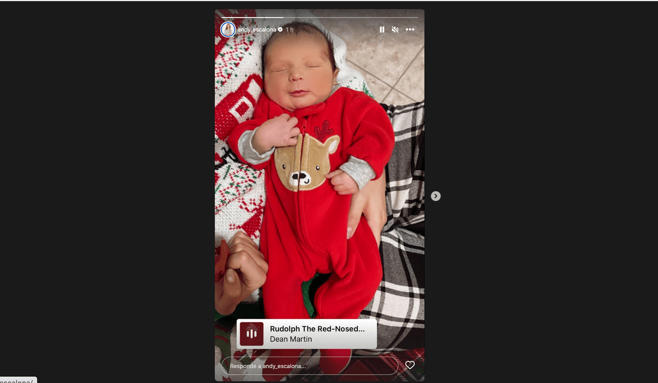 Hace unos minutos, Escalona publicó la más adorable imagen de su recién nacido, en la que se le ve vestido con un mameluco rojo que tiene al famoso reno Rodolfo como protagonista.