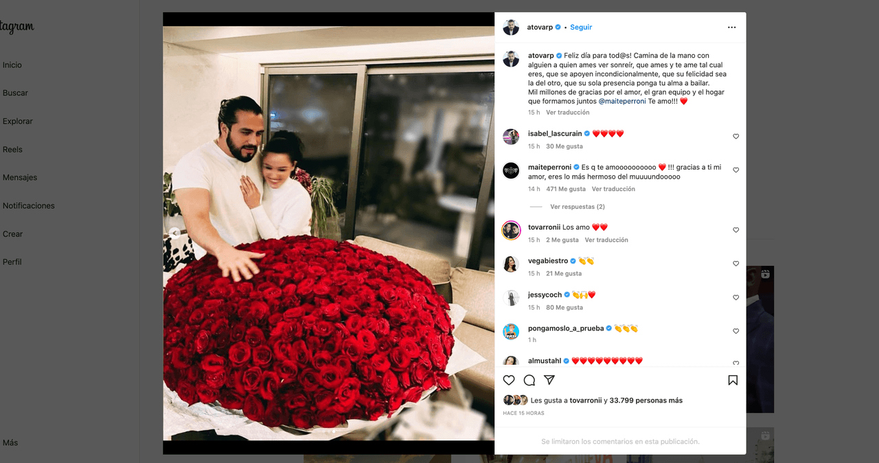 Se trata de un 'ramo' de cientos de rosas rojas con el que sorprendió a Maite. En la imagen se ve el majestuoso arreglo y a la feliz pareja abrazada. Para acompañar la publicación de Instagram, el productor le agradeció a su esposa "por el amor, el gran equipo y el hogar que formamos juntos".