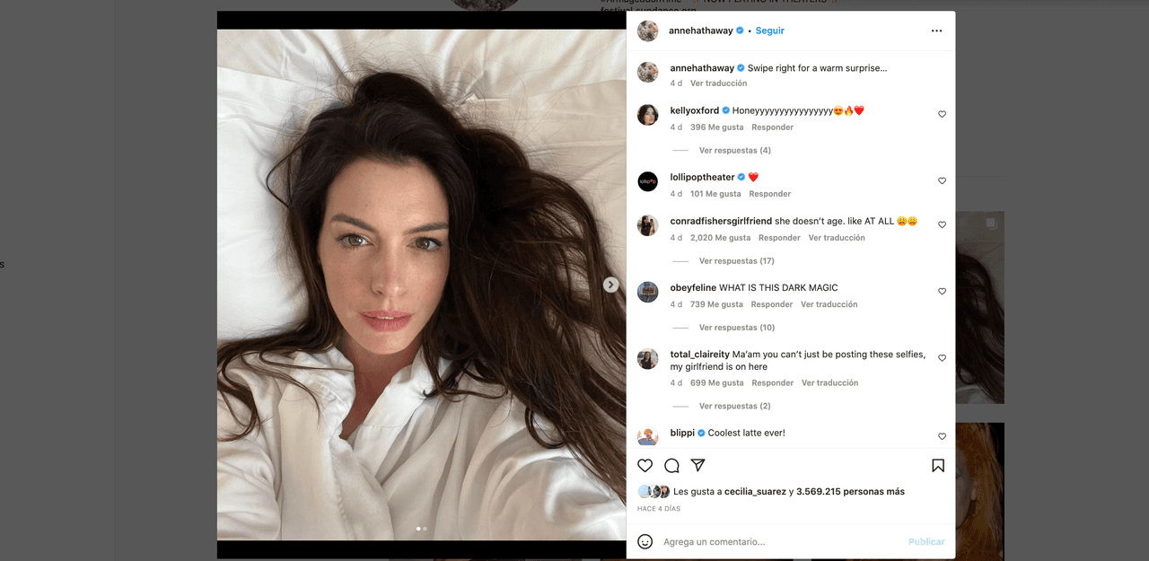 Los comentarios, como era de esperarse están repletos de halagos y frases positivas que exaltan lo guapa que se ve Anne en lo que parece ser una foto que decidió tomarse al poco tiempo de despertar.