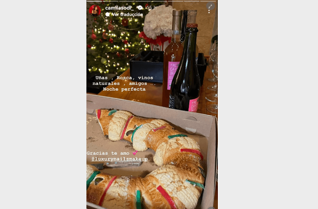 La actriz publicó en sus historias de Instagram la tradicional de rosca de Reyes, la cual dijo haber partido con unos amigos y combinado con unas cuantas de copas de vino.
