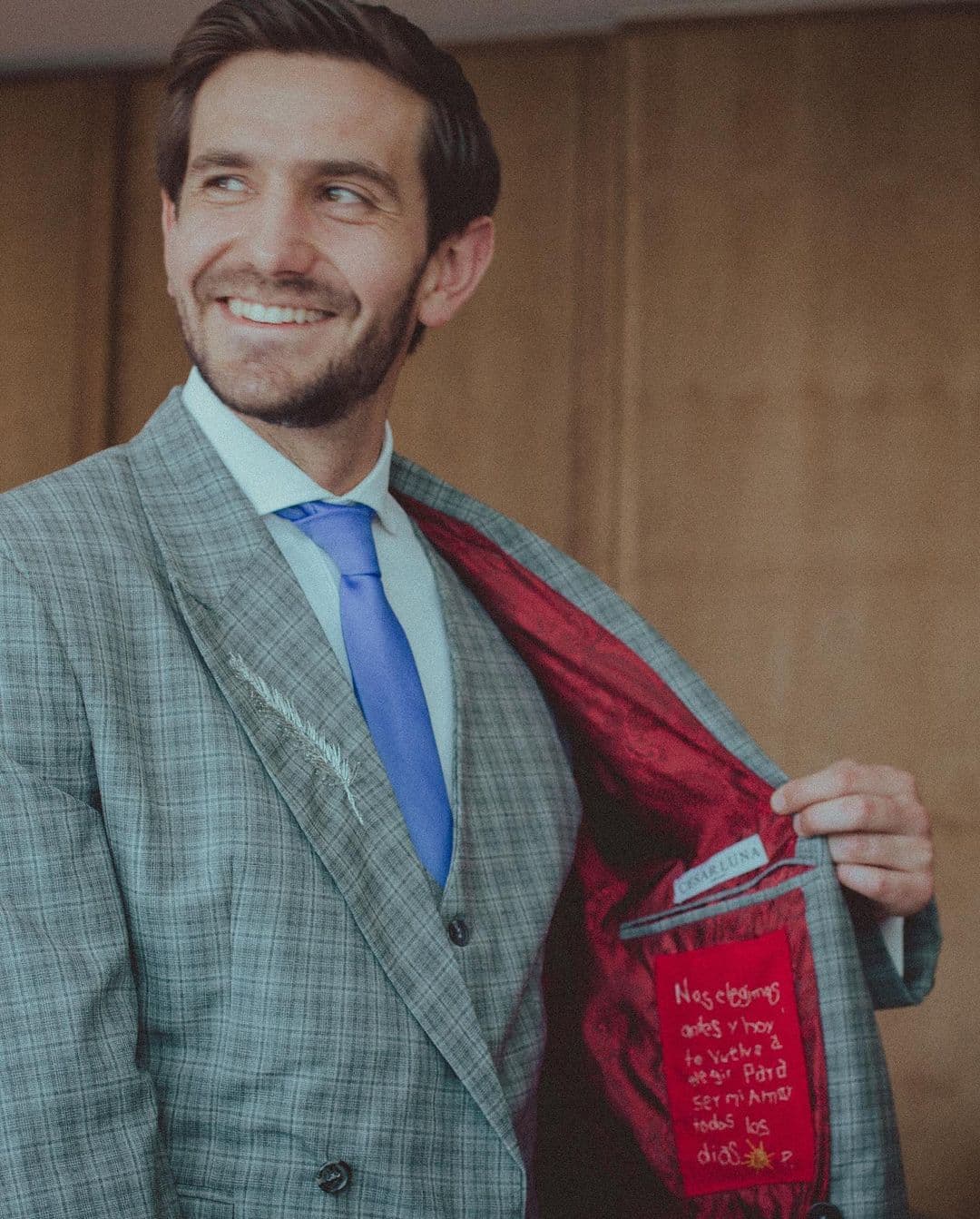 Resulta que el joven de 30 años de edad mandó a bordar el interior del saco que usó en su enlace con Paulina con una hermosa frase que se le e: "Nos elegimos antes y hoy te vuelvo a elegir para ser mi amor todos los días". Dicha leyenda estuvo acompañada de un sol y venía firmada con la letra "P", lo que nos hace pensar que ese mensaje se lo había dedicado la famosa y él decidió plasmarlo ahí.