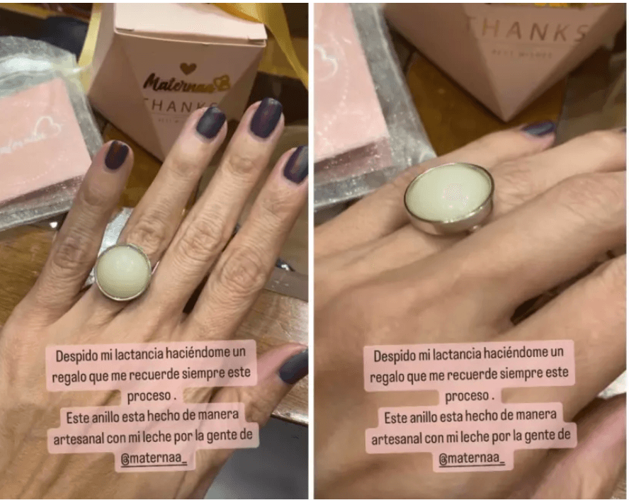 Así, la actriz presumió en sus redes sociales un anillo que se mandó a hacer, en el que encapsuló un poco de su leche materna para poder llevar un 'cachito' de esta etapa y de todos los aprendizjaes que tuvo en ésta, siempre consigo.