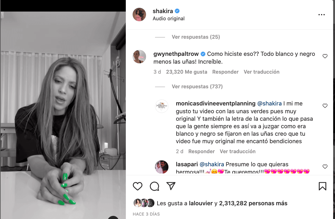 "Shak súper deprimida cantando, pero ‘wow tus uñas verdes’", "La Shaki cantando sus penas, la Gwyneth: ¡Qué uñas tan perronas!", fueron algunos de los comentarios recurrentes en torno a lo que resaltó Gwyneth.