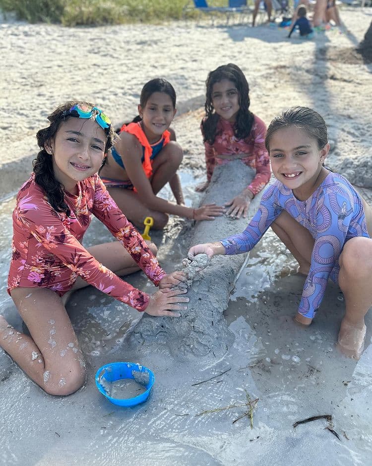 Los retoños de Jacky Bracamontes se dejaron ver felices, disfrutando de la arena y los juegos; la mayor de las hijas de la conductora, Jacqueline tiene 9 años, mientras que la segunda, Carolina recién cumplió 7, Renata 6 y las menores del clan, las mellizas Paula y Emilia cumplirán 4 años en diciembre.