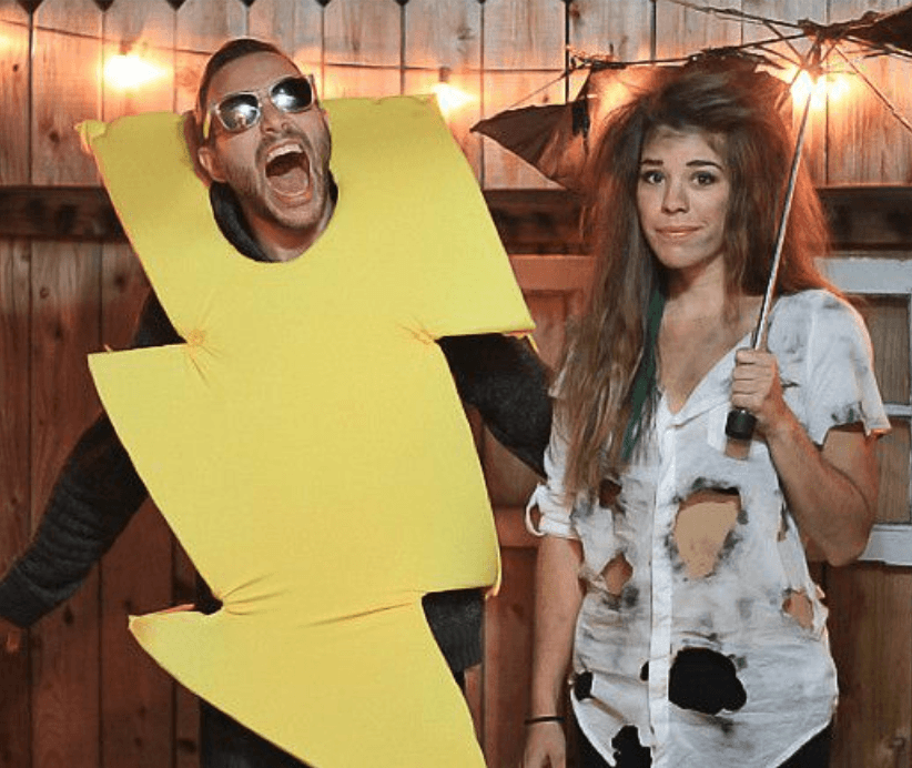 1) El rayo y el electrocutado: Elijan quién será quién y caracterícense con esta original disfraz únicamente cortando alguna cartulina amarilla en forma de rayo -con su respectivo hoyo para la cabeza- y rompiendo alguna playera que no usen, destruyendo un paraguas y alborotando el pelo para dar sensación de que se ha sido electrocutado. Agrega algunos detalles con maquillaje negro en la cara y cuerpo del 'electrocutado' para simular la ceniza.