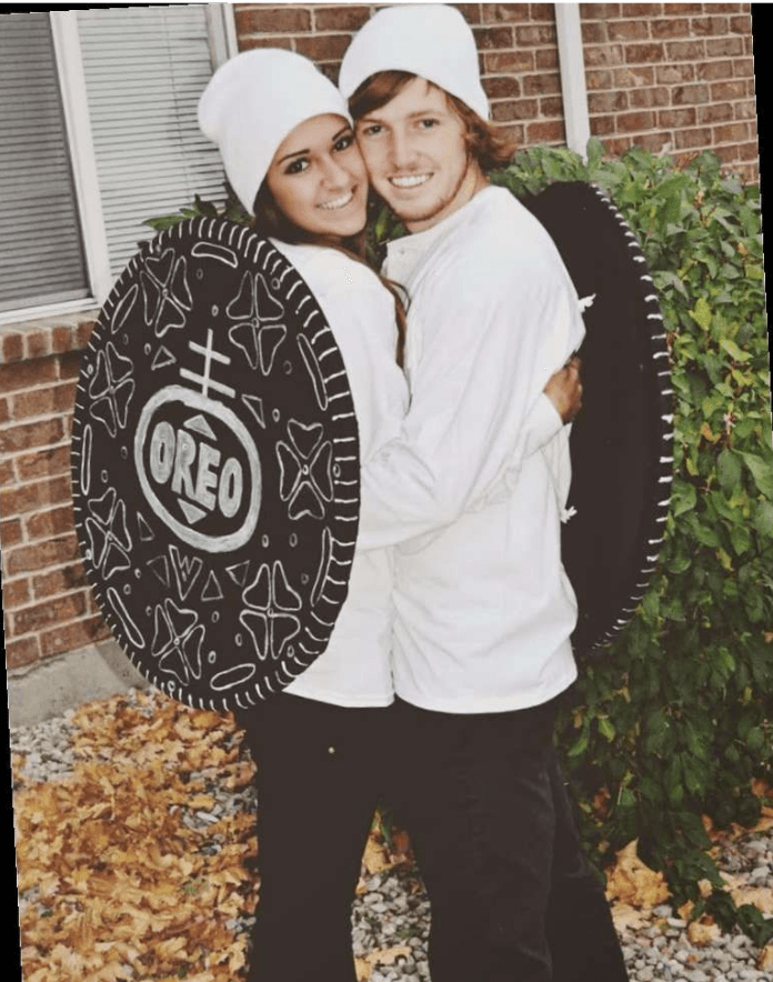4) Galletas Oreo: De lo disfraces más sencillos y tiernos que podrás encontrar. Para lograrlo, tú y tu pareja deberán vestir con pantalón oscuro y alguna sudadera o blusa de manga larga blanca. Después, en una cartulina de color café oscuro o negro, corten dos círculos que sean más grandes que sus espaldas. Con plumón blanco dibujen las clásicas figuras de la galleta, así como el nombre de la misma. Añadan tirantes para que puedan colgársela como si fuera backpack, ¡y listo! La idea es que tu pareja sea una mitad de la galleta y tú la otra, así que para las fotos no olviden abrazarse, todo mundo los amará.