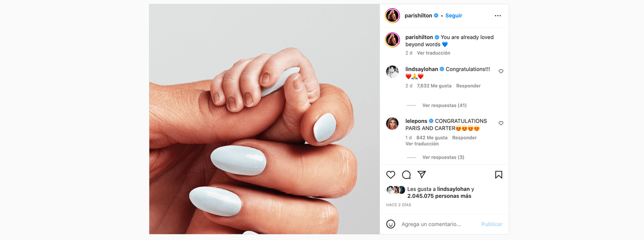 La heredera de una de las cadenas de hoteles más lujosas anunció apenas hace unos días que él y su esposo Carter son ahora padres de un pequeño. Aunque no han dado más detalles, se infiere que se trata de un pequeño niño, por el corazón azul con el que acompañó el mensaje en el que dio el anuncio.