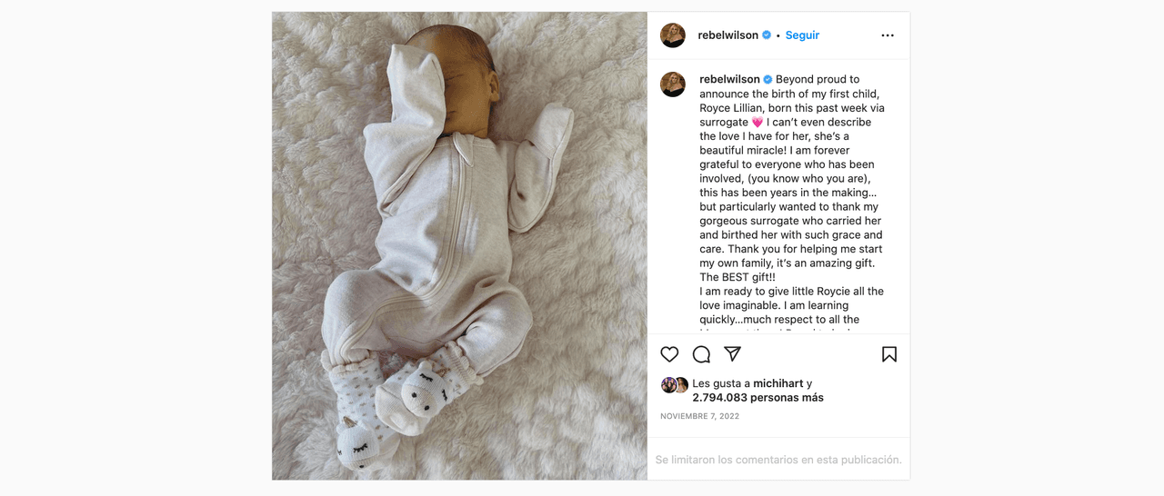 En noviembre del año pasado, la actriz de Hollywood sorprendió anunciando el nacimiento de mi primer hijo, Royce Lillian. A través de sus redes sociales, Rebel dedicó un tierno mensaje en el que afirmó que "¡es un hermoso milagro!", agregando que siempre estará agradecida con quien todos los involucrados, especialmente con la madre gestante.