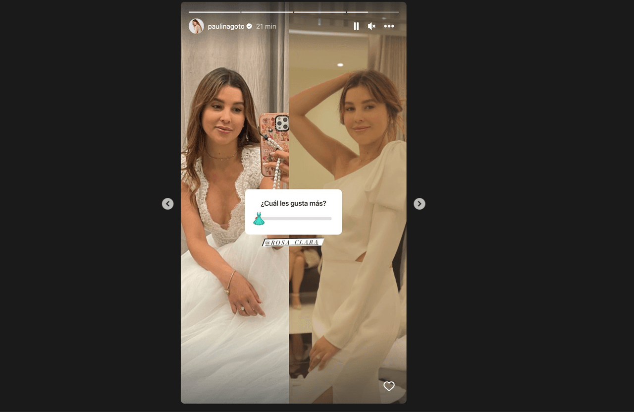 Si bien Paulina ya había dado un avance de los vestidos que se había probado, hace unas horas publicó una historia que conmocionó a Internet. En ésta se ve a la actriz usando dos elegantes vestidos de novia y una caja de encuesta en la que preguntó a sus seguidores qué vestido les gusta más.