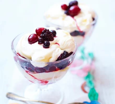 5) Después, vierte un poco de la mezcla de la crema y el yogur, y luego agrega un poco de la mezcla de bayas. Repite eso hasta que llegues al tope de la copa y decora con más bayas.