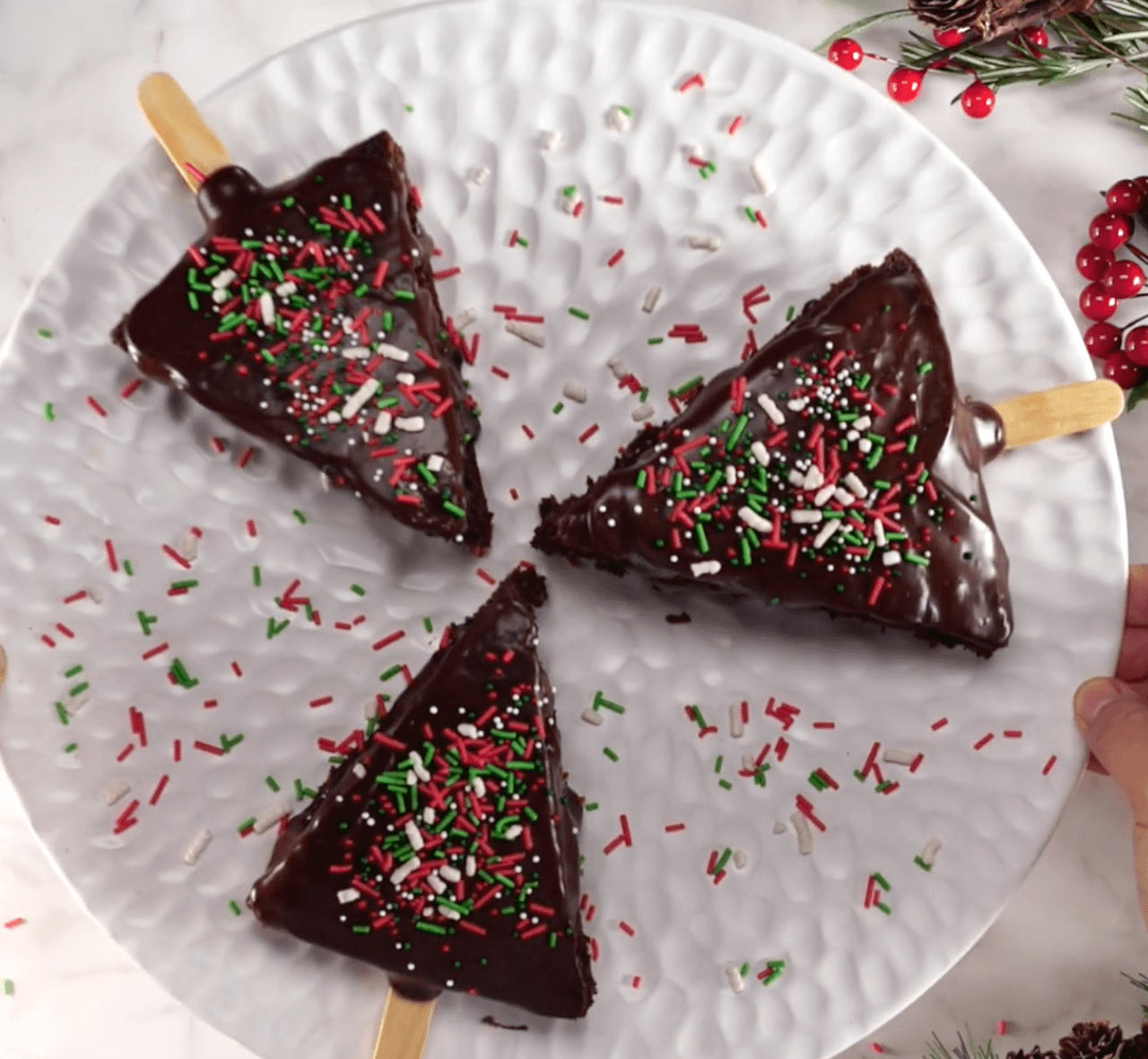 8) Corta el pastel en triángulos y coloca un palito de madera en cada uno para simular una paleta.