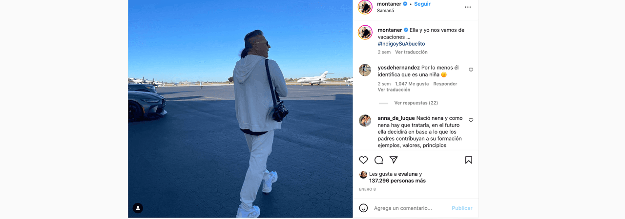 En ésta, se ve al cantante venezolano sostener a su nieta en brazos mientras caminan hacia un avión. En el texto, Ricardo escribió: "Ella y yo nos vamos de vacaciones #IndigoySuAbuelito". Esta frase le bastó para despertar la furia de los fans de Camilo y Evaluna ¿por qué?