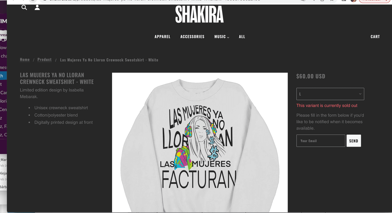 La prenda consiste en un pulóver de color blanco que tiene estampado un dibujo del rostro de la cantante con el look que lució en dicho video musical y, alrededor, la icónica frase "Las mujeres ya no lloran las mujeres facturan".