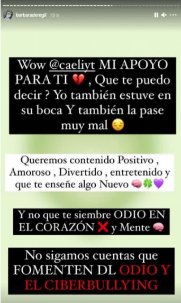 “Wow, Caeli, mi apoyo para ti, que te puede decir, yo también estuve en su boca (YosStop) y también la pasé muy mal. Queremos contenido positivo, amoroso, divertido, entretenido y que te enseñe algo nuevo. Y que no te siembre odio en el corazón y mente. No sigamos cuentas que fomenten el odio y el ciberbullying”, escribió Bárbara De Regil.
