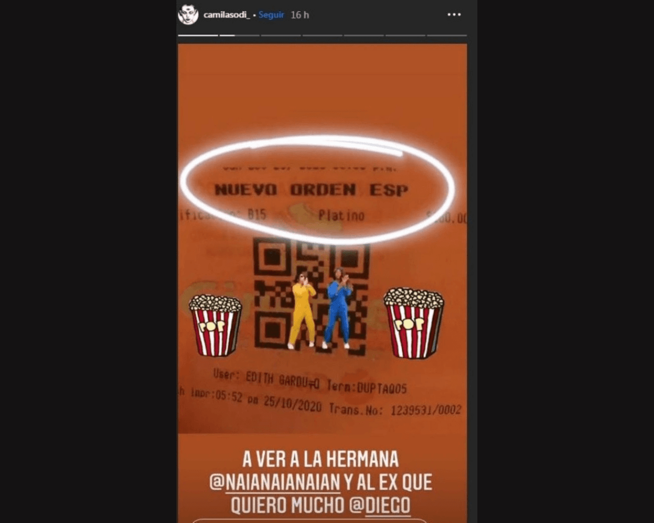 De acuerdo con información de la revista Quién, la actriz subió una Instagram Story en el que presumió un boleto de cine para asistir a ver la nueva película ‘Nuevo Orden’, en la que aparece su hermana Naian González Norvind y Diego Boneta.