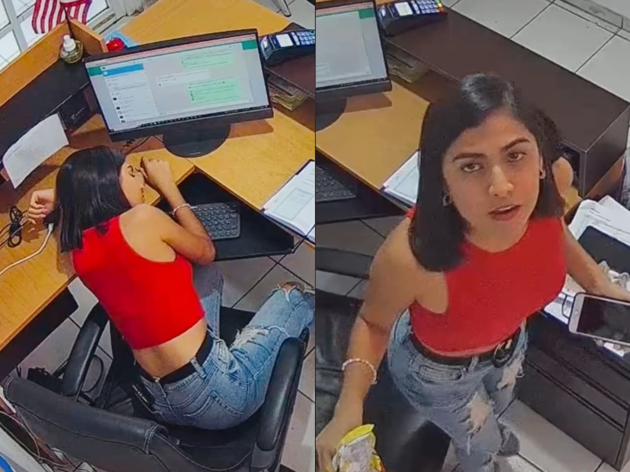 La chica, quien se mostró muy sorprendida por ser descubierta, termina por levantarse de la silla en su escritorio y caminar a lo que podría pensarse la oficina donde le contarían todo lo que vieron durante sus supuestas horas de trabajo.