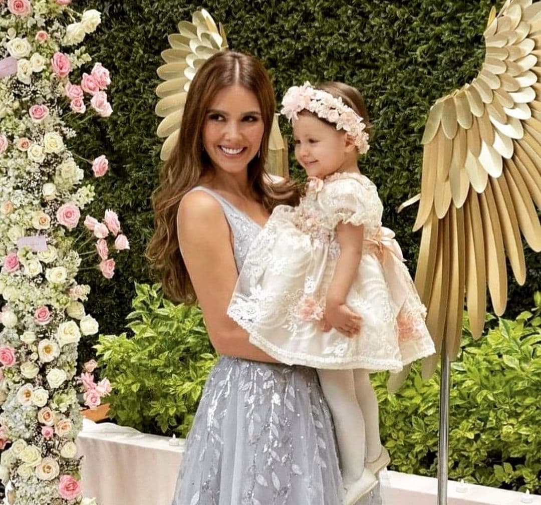 La bebé de un año y nueve meses lució un encantador vestido en color blanco con una corona de flores, mientras su guapa mamá se dejó ver modelando un vestido de tul en color azul cielo con lentejuelas, perlas y brillos. Ambas posaron en para una tierna sesión de fotos madre e hija, en la que aprovecharon una lujosa decoración de arcos de flores y unas grandes alas doradas.