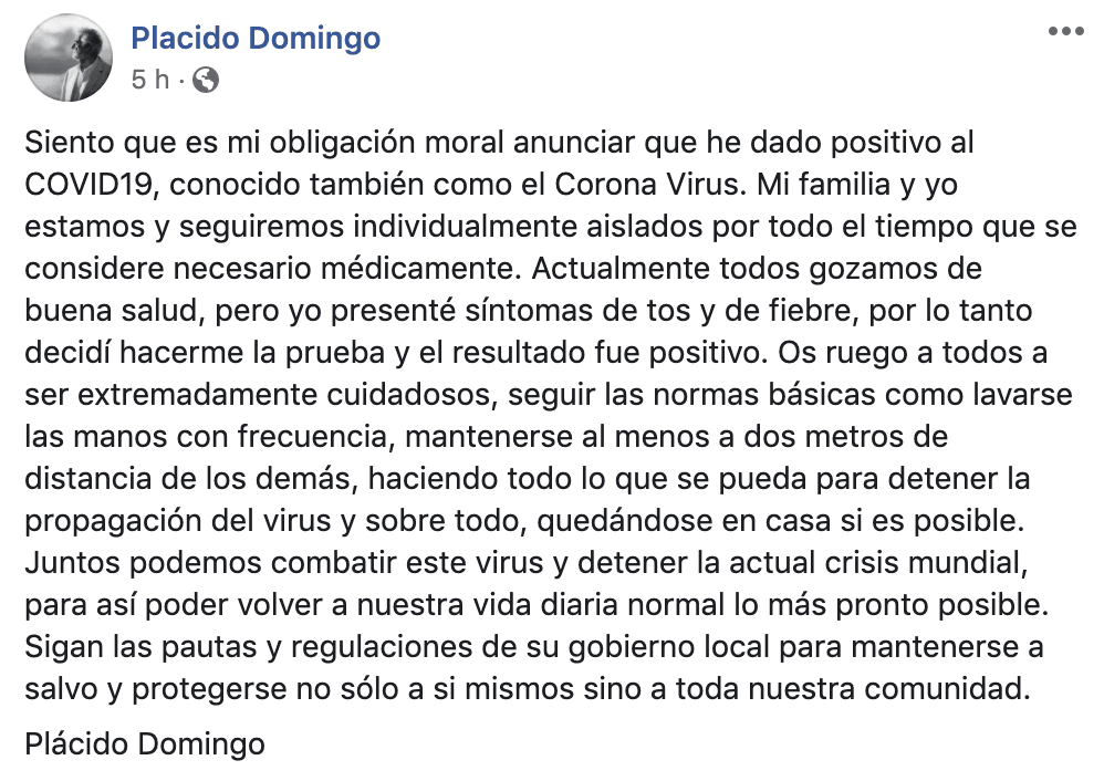 A través de un comunicado, Plácido Domingo anunció que se encuentra en aislamiento tras haber contraído coronavirus. “Siento que es mi obligación moral anunciarles que he probado positivo para COVID19”, escribió.