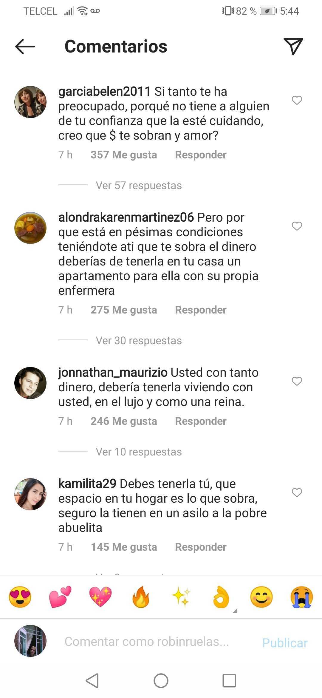 "Si tanto te ha preocupado, ¿por qué no tiene a alguien de tu confianza que la esté cuidando? Creo que dinero te sobran y amor", "¿Por qué está en pésimas condiciones teniéndote a ti que te sobra el dinero? Debería tenerla en tu casa en un apartamento para ella con su propia enfermera", "Usted con tanto dinero, debería tenerla viviendo con usted, en el lujo y como a una reina", una larga lista de comentarios expresando la misma idea con quejas que hacen referencia a la fortuna de Thalía y el abandono en el que la abuela vivía.