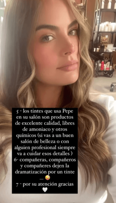 “Y todas las que me están escribiendo que cómo es posible que me pinte el pelo embarazada o preguntándome que a las cuántas semanas se pueden pintar el pelo si están embarazadas...yo nunca haría algo que dañe a mi bebé o embarazo”, escribió.