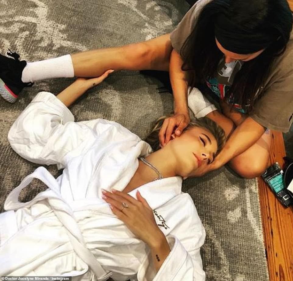 Al final de la noche, la doctora quiropráctica Jocelyne Miranda compartió una imagen en la que se puede ver a la esposa de Justin en el suelo usando una bata de baño mientras Miranda alivia sus dolores de cuello; la doctora sólo añadió a la foto, “la novia”.